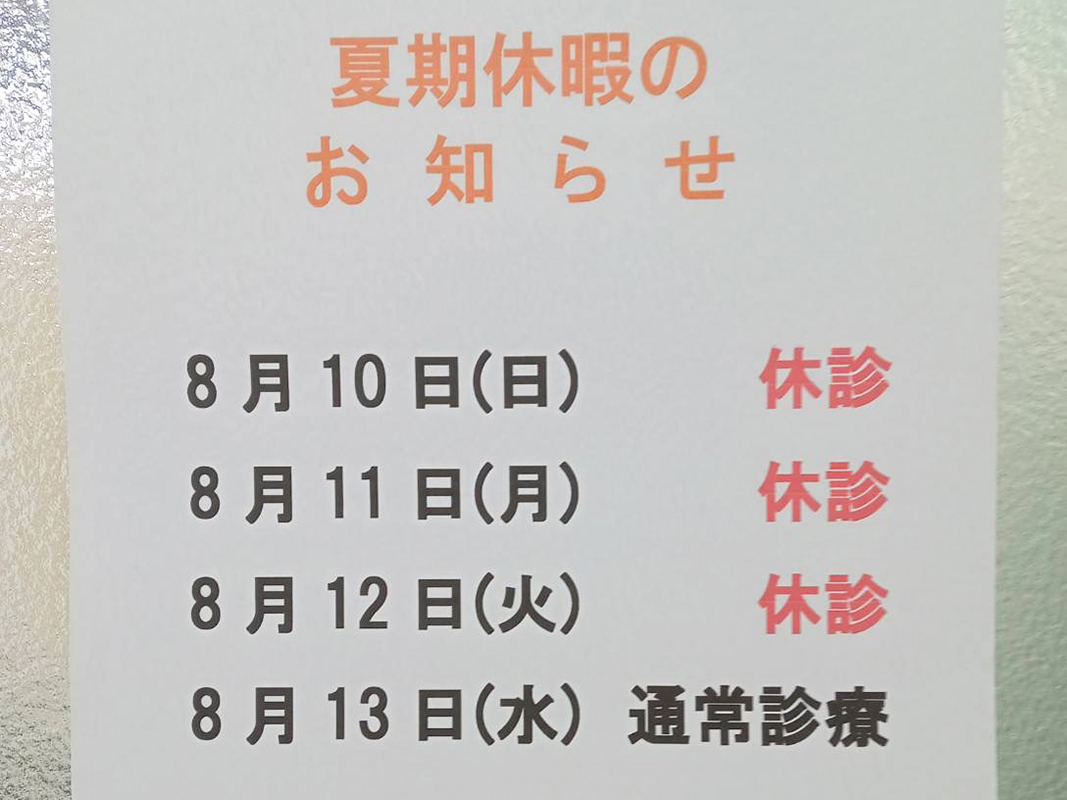お知らせ ホーム お知らせ 夏季休診のお知らせ 夏季休診のお知らせ 2025.08.06 お知らせ 【夏季休診のお知らせ】 8月10日(日)~ 12日(火): 休診 8月13日(水) : 通常診療 よろしくお願いいたします。