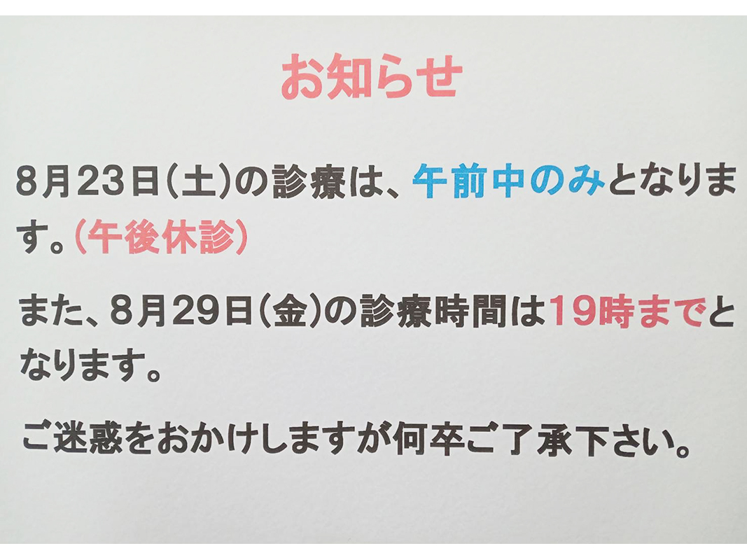 お知らせ ホーム お知らせ 8月23日(土)、29日(金)の診療について 8月23日(土)、29日(金)の診療について 2025.08.18 お知らせ 診療時間 8月23日(土)の診療は、 午前中のみ(午後休診) となります。 また、8月29日(金)の診療は、 19時まで となります。 ご迷惑をおかけしますが何卒ご了承ください。